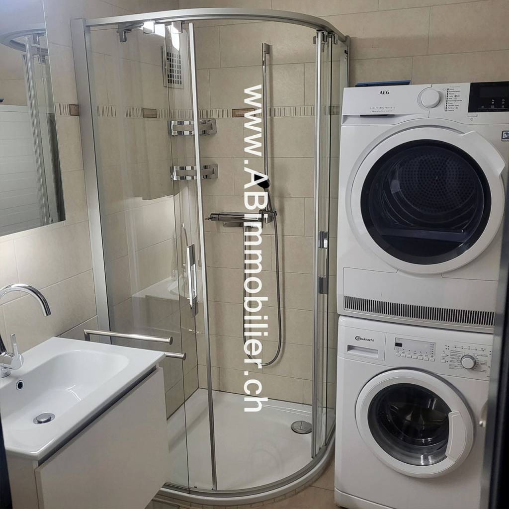 Entrée au rez supérieur avec accès à une cuisine toute équipée / coin repas + salon + Chambre + salle de bain / douche WC. Espace avec colonne de lavage