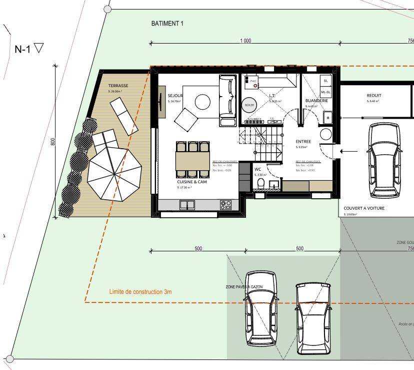 Chalet Construction, villa / chalet de 4.5 p sur 4 demi-niveaux de 147.20 m2 de venteCes demi-niveaux permettent de délimiter les espaces de façon harmonieuse dans ce logement. C'est un type de construction très lumineux grâce à ses espaces ouverts. C'est donc une merveilleuse façon d'allier l'espace et la luminosité. Premier ½ niveau, hall d’entrée, buanderie et local technique, wc visiteur. ½ niveau supérieur, cuisine, espace repas, séjour dans un volume individuel. Accès terrasse vue panoramique magnifique. ½ volume supérieur, 2 chambres avec salle de bain avec baignoire. ½ volume supérieur chambre parentale avec espace dressing et/ou bureau et salle de bain / douche. Couvert à voiture pour + places de parc extérieures Prix 1'220'000.- Réf 23109