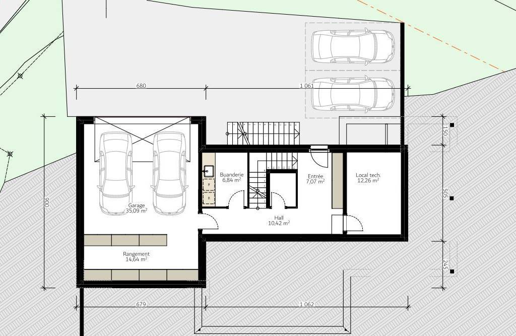 Sous-sol avec garage pour 2 véhicules, hall d’entrée du rez inferieur, buanderie et local technique.