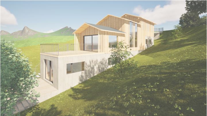 Le projet prévoit une villa d’environ 194 m², répartie sur trois niveaux, avec de généreux espaces extérieurs, terrasse et espace jacuzzi, faisant face à une vue panoramique spectaculaire sur les montagnes.