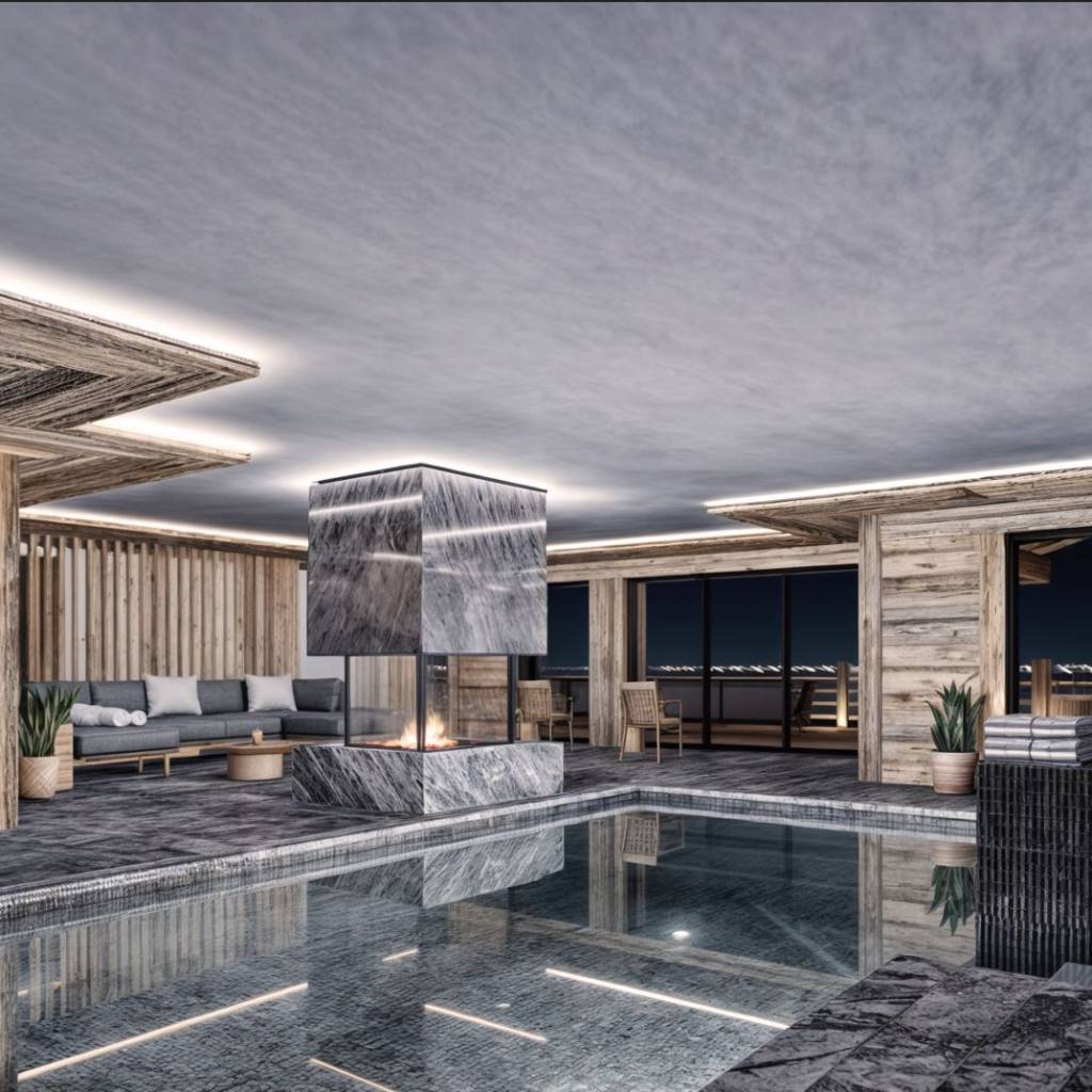 • Piscine intérieure avec jacuzzi intégré, ouvrant sur une grande terrasse ensoleillée, agrémentée d’une seconde cheminée centrale avec feu ouvert.