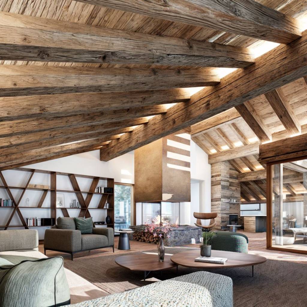 • Une vaste pièce à vivre au dernier étage, dotée d’une cheminée impressionnante et d’une charpente en vieux bois qui sublime les volumes.